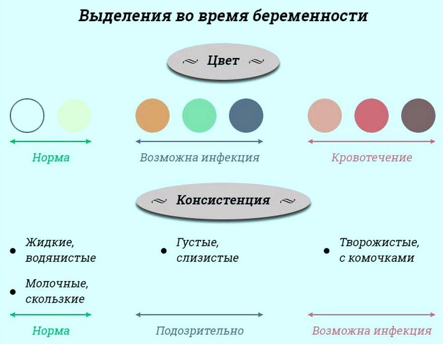 Нормальными также считаются светлые водянистые выделения, прозрачные или молочно-белые. Такой цвет указывает на образование слизистой пробки в репродуктивной системе, которая защищает будущего ребенка от инфекций и патогенных бактерий.