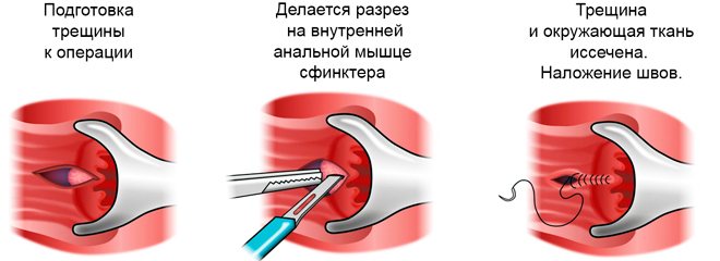 — неэффективность консервативной терапии на протяжении 2-х месяцев; — хроническая анальная трещина с зарубцевавшимися гиперпластическими краями; — ригидное сужение анального канала в результате продолжительного спазма; — сочетание недуга с геморроем и прочими патологиями, требующими хирургического вмешательства. | — тяжелое общее состояние пациента; — острая форма инфекций; — кровотечение, сбои в процессе свертываемости крови; — развитие воспаления в зоне прямой кишки (оперативное лечение показано после его устранения); — онкологические недуги. |
